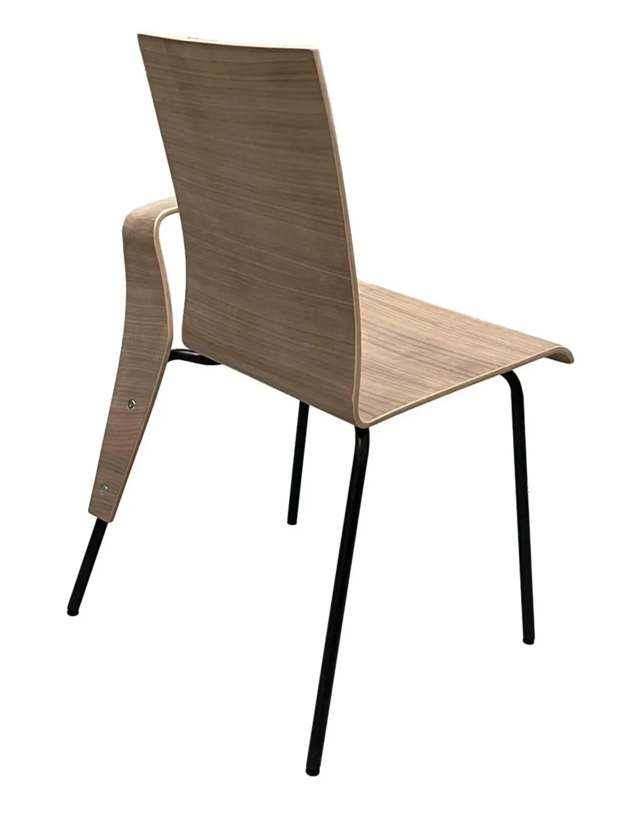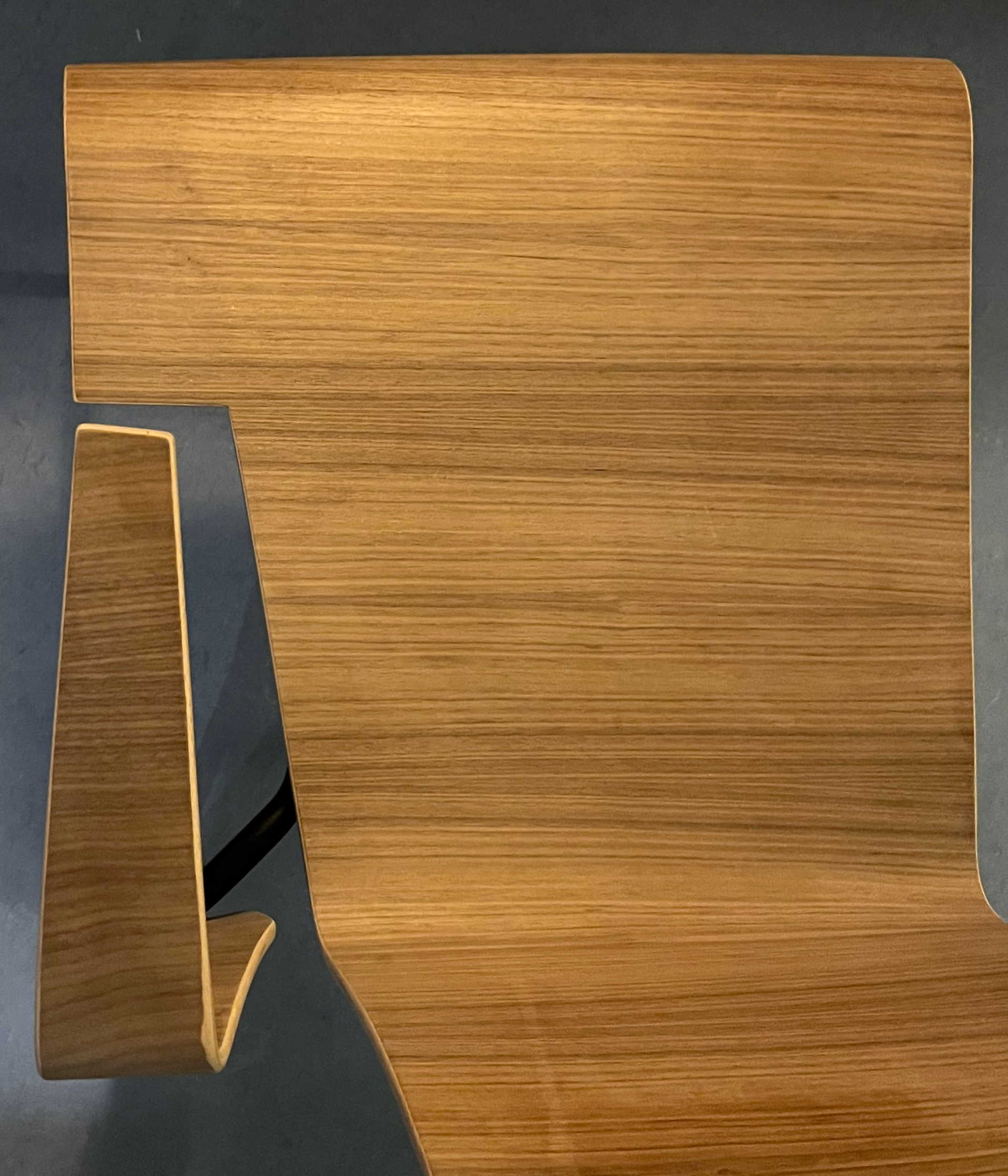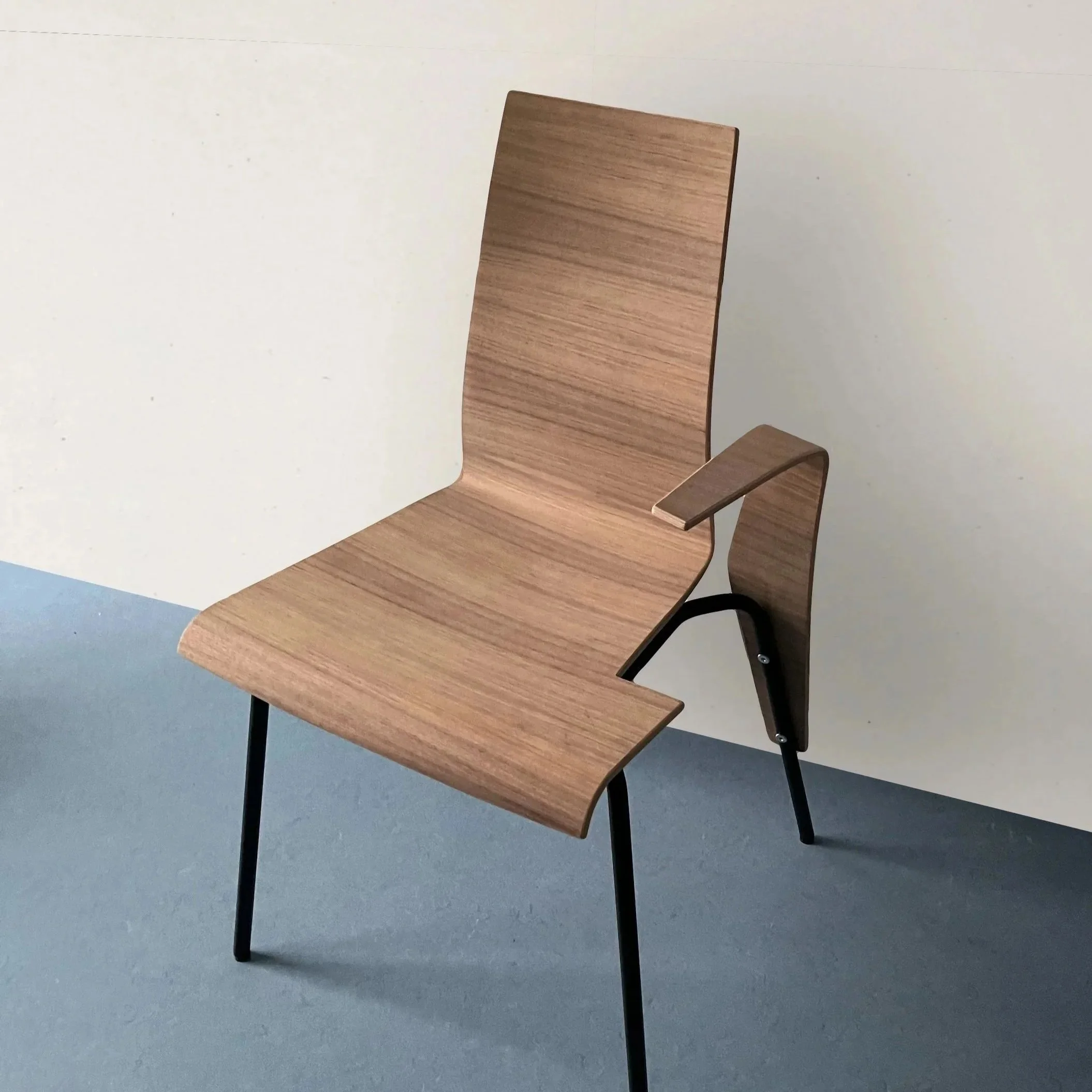 In my furniture design workshop in Copenhagen, I was given a simple prompt: design a chair with two pieces, a premolded plywood seat blank and a bent stainless steel tube base. With a single cut and a simple rotation, I transformed these elements, creating a firm but dynamic piece with increased functionality. While the cut from the seat removes a perceived negligible amount of material, the offcut comprises the armrest, granting support for the user to lean, slouch, or even sleep. The created negative space highlights the linear motifs that transect the piece and juxtapose the plywood's flexible form.